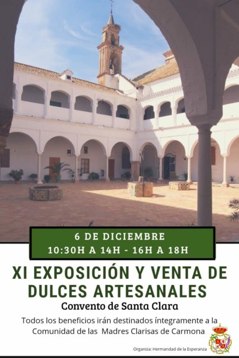 Estáis todos invitados el proximo 6 de diciembre a nuestra undécima exposición y venta de dulces artesanales realizados por nuestra comunidad y organizada por la Hermandad de la Esperanza de Carmona.