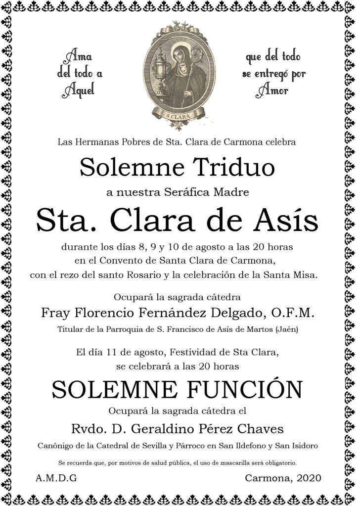 Os esperamos a los cultos que celebraremos en nuestro convento de Carmona en honor de nuestra santa Madre Clara de Asís.