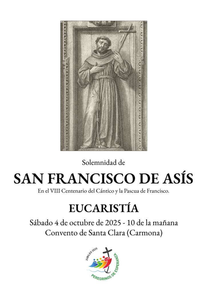 Este sábado 4 de octubre celebraremos la festividad de San Francisco de Asís. Estáis invitados a compartir la Eucaristía con nuestra comunidad a las 10 de la mañana, la cual será oficiada por nuestro capellán D. Genaro Escudero Ojeda.